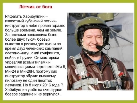 Сегодня в Кореновском районе чтят память командира 55-го отдельного Севастопольского ордена Кутузова 2-й степени вертолётного полка армейской авиации, полковника Ряфагатя Хабибуллина. 8 июля 2016 года, в небе над Сирией, был сбит российский боевой вертолёт МИ-35. Среди погибших при исполнении Воинского долга лётчиков был наш земляк, Герой России.
